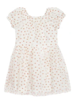 Prepare to feel your heart melt! Dress your little one in this precious style that’s ideal for Valentine’s Day, Easter or any warm weather occasion. Beautifully made of soft knit, with an airy tulle overlay adorned with flocked hearts. Puffed sleeves and tiny ruffles add to its charm.