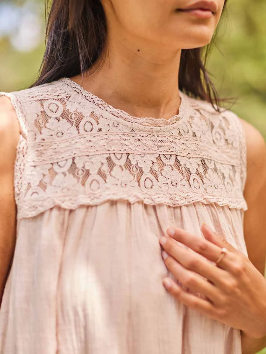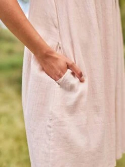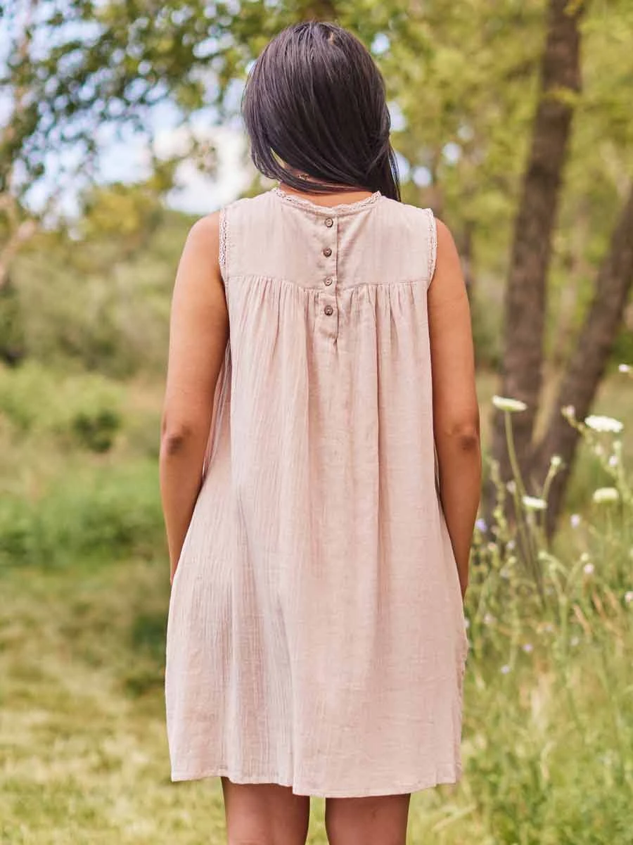 Match your mini in this graceful, carefree dress. The free-flowing silhouette is defined by a lovely lace panel and gentle gathers on the bodice. Back buttons and practical side pockets finish this perfect springtime style.