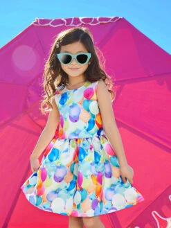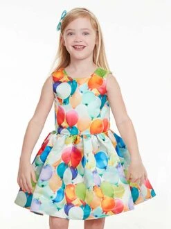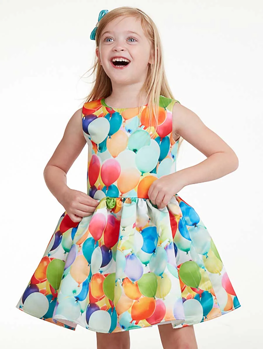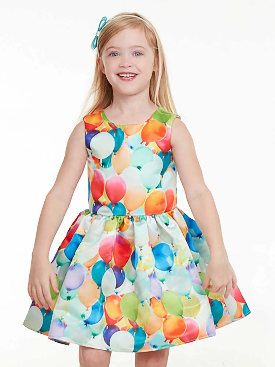 With its festive and colorful balloon print, this might be the perfect party dress! The sleeveless fit and flare style features a full skirt with that “extra fancy” feel girls love. Perfect for any spring party or special occasion, such as birthdays!