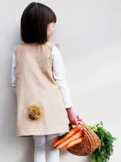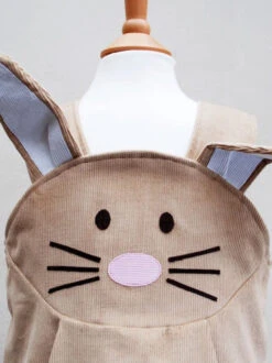 Bunny Rabbit girls character dress is made from soft camel baby cord with a hand made applique face,complete with pom pom tail. Wear as a fancy dress costume or simply as an every day dress, the cute rabbit face and paw pockets will inspire their imagination.