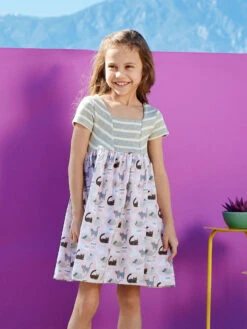 You don’t have to be a cat lover to love this fun dress! Super-cute and all-day comfy, it’s a great go-to style for warm weather. Playdates, school, casual dress-up occasions… Look for a soft rayon jersey bodice and full cat-print skirt, with handy pockets, no less!