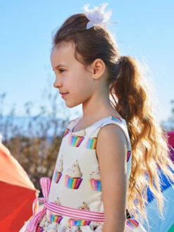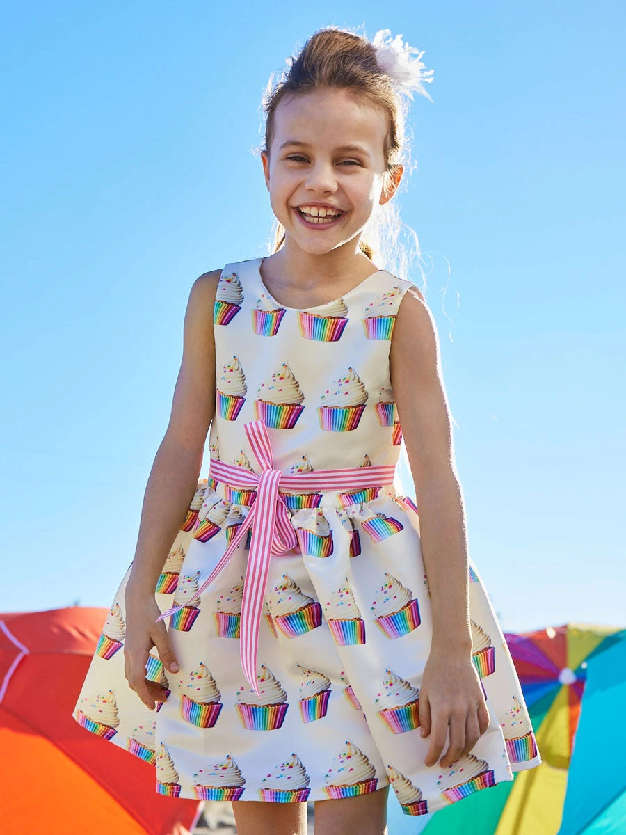 Treat her to an even sweeter birthday with this fun dress. Covered with a colorful cupcake print, the classic style is finished with ribbon trim at the waist. While itβs ideal for birthday girls, this party dress is an adorable choice for any special occasion.