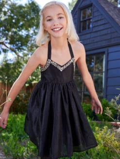 You can never go wrong with a little black dress! If your holiday calendar’s filling up with parties, recitals, concerts and so on, your daughter’s going to need a beautiful dress. Here’s an elegant style she will love. Styled with a halter neckline and full skirt that’s twirly and fun. The embellished v-neckline adds extra sparkle – a must for the holidays!