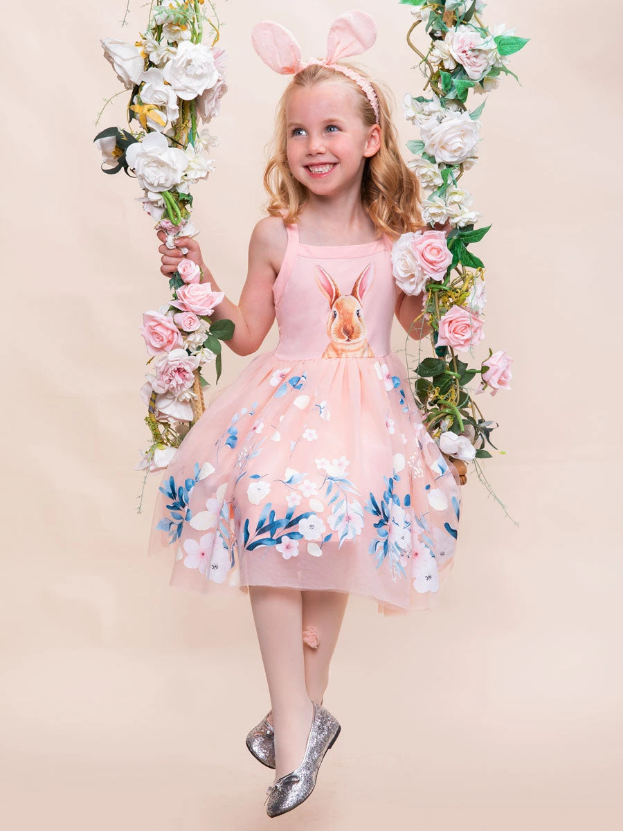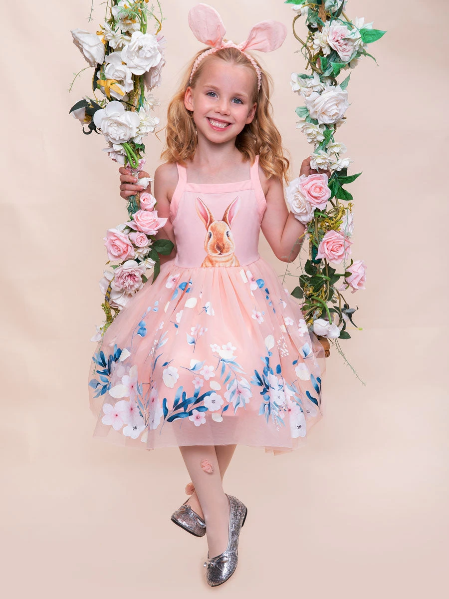 A perfect springtime, Easter or anytime dress! An adorable bunny adorns the bodice, while a shower of flowers dresses up the skirt. It comes with a cute rabbit ears headband (that she’ll likely want to wear any time, just for fun). Notice the tights, which are also included, feature a fuzzy pompom on the back of each leg. Because what’s a rabbit without a fuzzy tail! This is an outfit she’ll love now, and remember fondly for years to come.