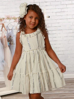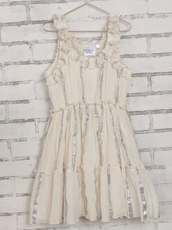 Both dreamy and dramatic, this special occasion dress is detailed with soft flowy fabric embellished with metallic silver ribbon. Ruffles decorate the neckline and armholes, the elasticized waist and tiered skirt. And she’ll love the skirt’s twirl-ready fullness. Whatever special events are on your calendar, this unique dress will let her shine.Â