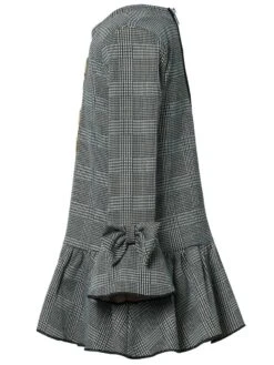 Classic glen plaid gets a fun update here. The dropwaist silhouette features long sleeves with bell cuffs and bows, an exposed back zipper, and is topped with leopard-print faux fur bow appliqués on the bodice. Super-cute!