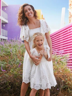 Welcome summer with this sweet dress. Soft embroidered cotton fabric is detailed with a smocked bodice, floaty handkerchief sleeves, and a scalloped hem. Best of all, there’s a matching dress for mommy! Perfect for special days and everyday play.