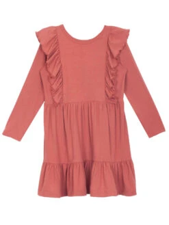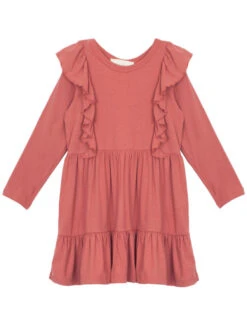 Here’s a ready-to-play dress that’s perfect for back-to-school, the park and hanging out on the weekends. The knit feels wonderfully soft, and is styled with an easy elasticized waist and super-cute ruffles on the bodice.