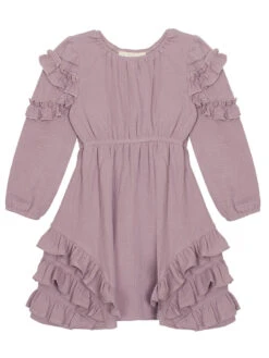 Charming and twirl-ready, this lavender dress makes a great addition to her fall wardrobe. Soft cotton fabric is styled with an easy elasticized waist, neckline and cuffs. Ruffle detailing ups the cuteness factor even more.Â
