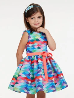 Calling all mermaids! This colorful party dress is for you. The classic fit and flare style features a multicolored scallop print with a pretty sash at the waist. Perfect for all her springtime soirees.