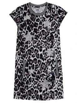 If you love leopard prints, don’t pass up this easy-to-wear knit dress! It’s topped with dazzling stars and striped trim. Your friends will love it, too.