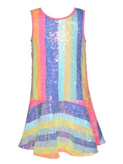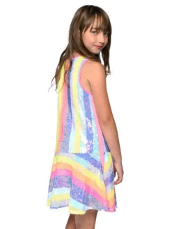 If your girl loves all things colorful and shiny, this dress will make her happy! Wide rainbow stripes are covered with sequins, for sparkle here, there and everywhere. With all that and such an easy fit, she’ll want to wear it as often as possible.Â