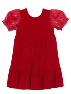 A picture-perfect holiday dress for your daughter if you’ve got seasonal parties, school recitals or tickets to The Nutcracker. Crafted of rich red velvet, it has organza puff sleeves and a twirly bottom flounce. We love the back, which has a slight v-neck trimmed with organza and topped with a bow. Beautiful! ‘Tis the season for coordinating outfits, so there’s red velvet for little sister, too.Â