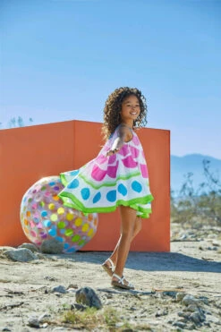 She’ll twirl right through spring and summer days in this fabulous dress. A bold print and vibrant colors make it a must for any girl’s wardrobe. As for the circle silhouette…nothing beats it for pure comfort and twirlability. Perfect for parties and everyday play.