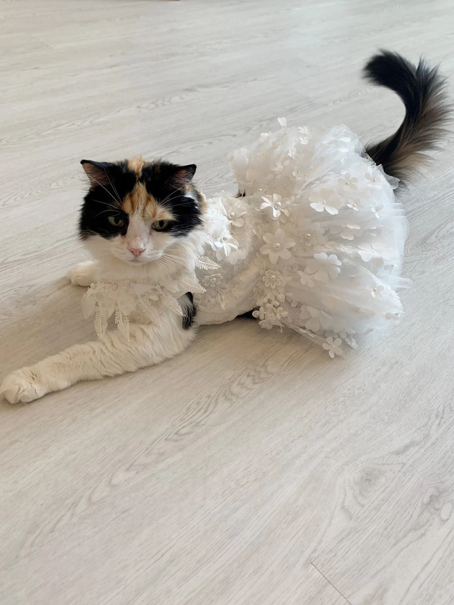 Here comes the charm…your dog will look adorable in this bridal dress with pearl and fabric flower embellishments. The skirt features layers of soft mesh for fullness. Unforgettable and fun.