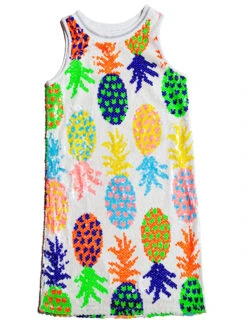 A cool pineapple print bursting with color makes this sequin dress pop. The easy-to-wear shift style has a round neck and sleeveless comfort.