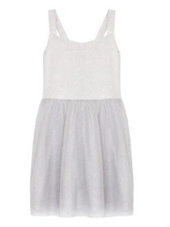 Elegance and simplicity in one gorgeous dress. The shimmery knit style features a delicate tulle overlay, and in back, a ribbon sash ties into a bow. Back straps and smocking add the perfect finish. It’s just the thing for young ladies who aren’t into frills.