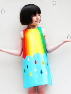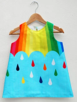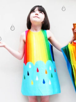 The girls rain drop dress is made from an exclusive print design and  fully lined in fine cotton voile, with a high quality finish. The fabric is inspired by umbrellas in the spring rain and the spectrum colours are vivid and give a real feel good factor.