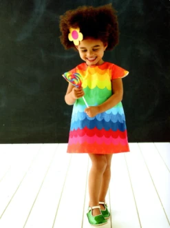 Little girls vivid rainbow scallop print A-line dress with cap sleeves. Made from an exclusive print design this dress is fully lined in fine cotton voile, with a high quality finish. The dress is perfect for a candy girl rainbow or summer party.