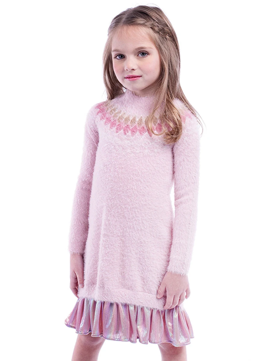 Delight your daughter with this cozy and unique dress. Features a fair isle-inspired top that feels like a soft, cozy sweater. A metallic rainbow flounce at the bottom is kicky and fun. Style it with boots or flats β either way itβs adorable.