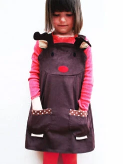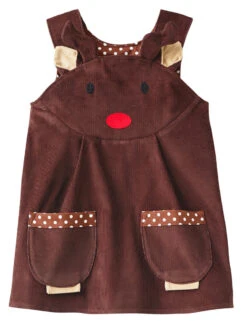 Reindeer dress for toddlers and girls in beautiful soft brown corduroy. This dress makes a perfect Christmas gift or for a special winter party. The reindeer dress is cut in a classic pinafore shape in chocolate brown super soft 100% cotton needle corduroy and features a cute reindeer applique face on the front yoke, with little ears, horns, and matching paw pockets. Encourages role play.