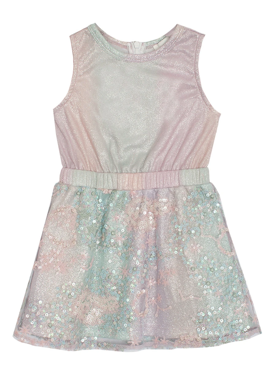 Your little mermaid princess will adore this dreamy dress. Awash in pretty pastels that shimmer in the light, its skirt features a soft tulle overlay covered with sparkly sequins. An easy elasticized waistband gives her all-day comfort (don’t have to be a mermaid to like that!).Â