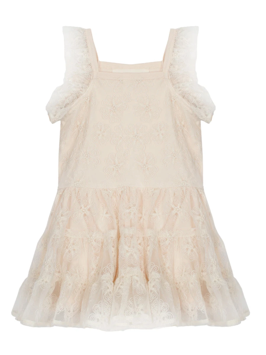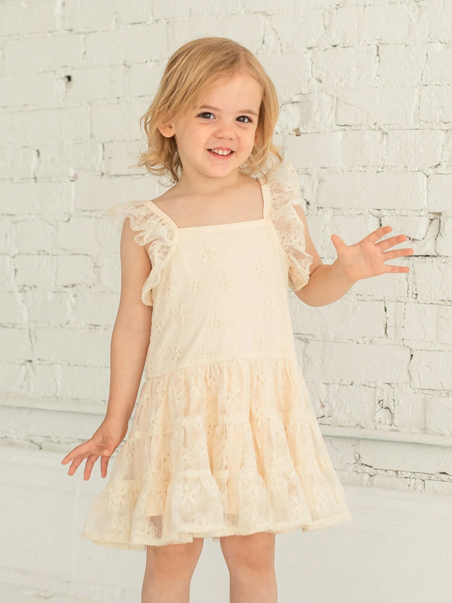 We love how lovely this dress is! Beautifully made, it features a soft netting overlay with embroidery and fluttery ruffles at the shoulders. Picture your girl wearing it to a wedding, Easter celebration, or any invitation that calls for fancy dressing.