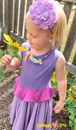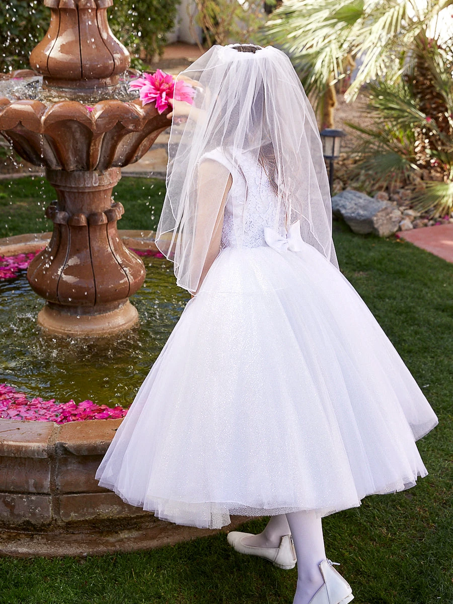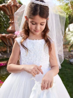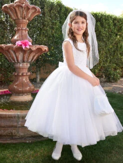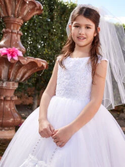 This could be the dress of her dreams. Beaded venise lace graces the bodice, the ball gown-inspired skirt is made of gathered tulle over glitter tulle. Even the back is beautiful, with covered buttons and a bow at the waist. An unforgettable style for first communion, it’s a gorgeous choice for flower girls, too.