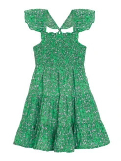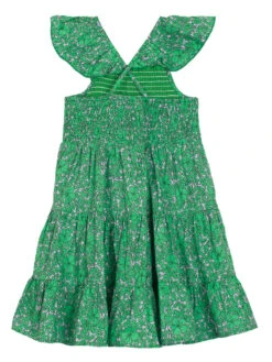 Welcome spring with this easy-as-pie dress in a vibrant green print. Smocking, ruffles and a twirly skirt turn the comfy style into a sure-to-be favorite for upcoming seasons.Â