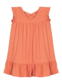 You’ll love the luscious color of this adorable knit dress. It couldn’t be more comfortable, thanks to the soft knit and easy-all-over fit. Ruffles and a crisscross back detail add to its girly appeal.