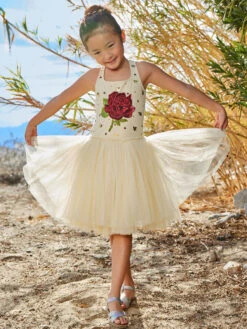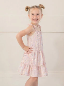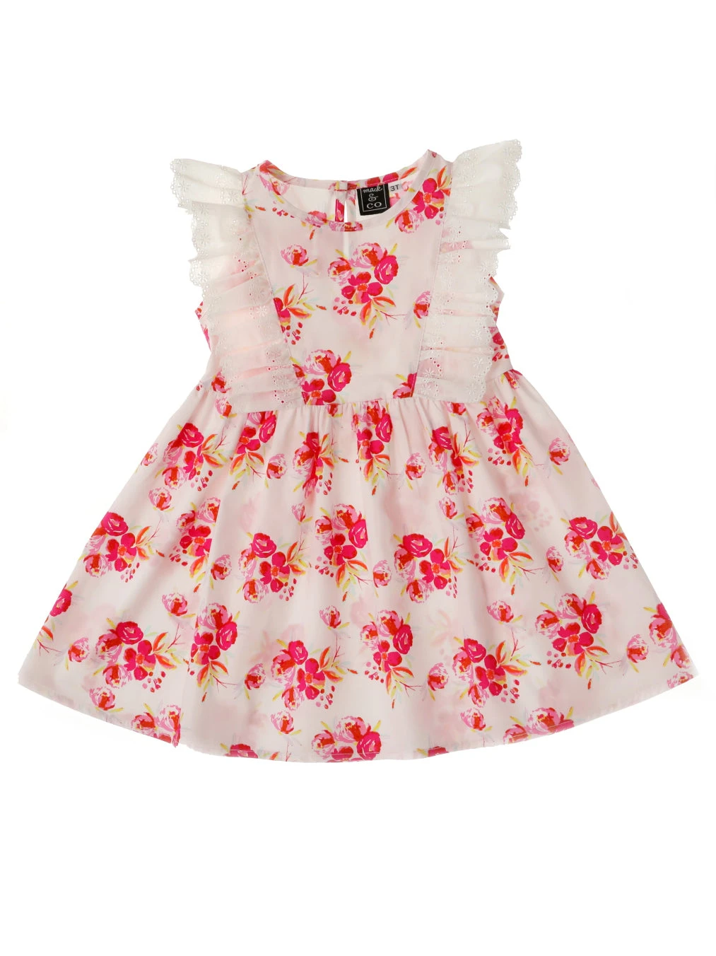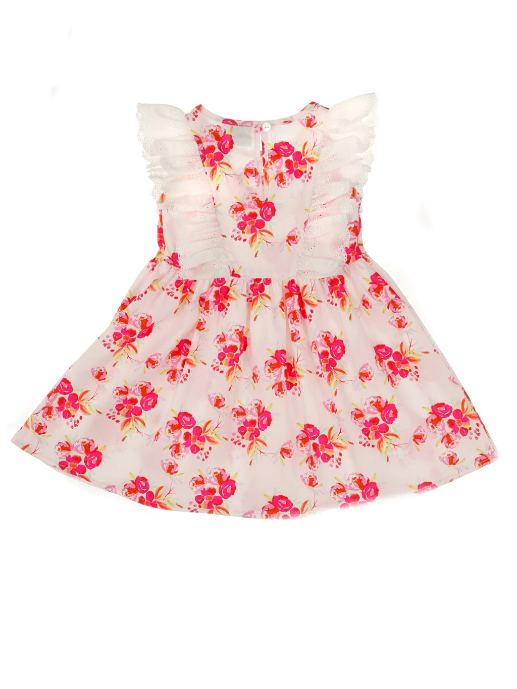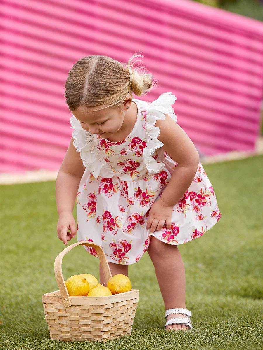Your girl will look so pretty in pink and white floral. This sweet dress is styled with eyelet ruffle trim, a full gathered skirt and back button. Perfect for all kinds of summer outings. Pair with baby style for a mini-me look for sisters.