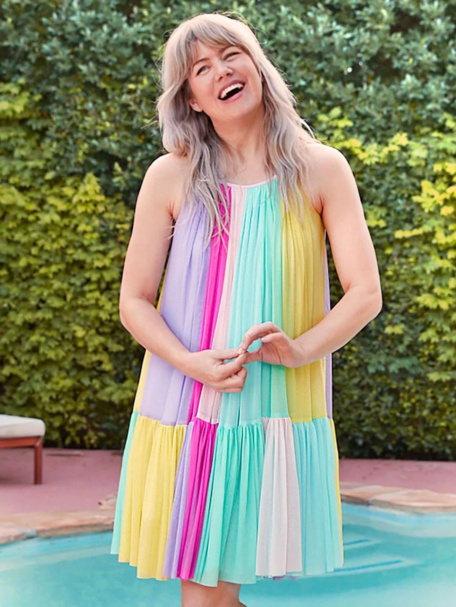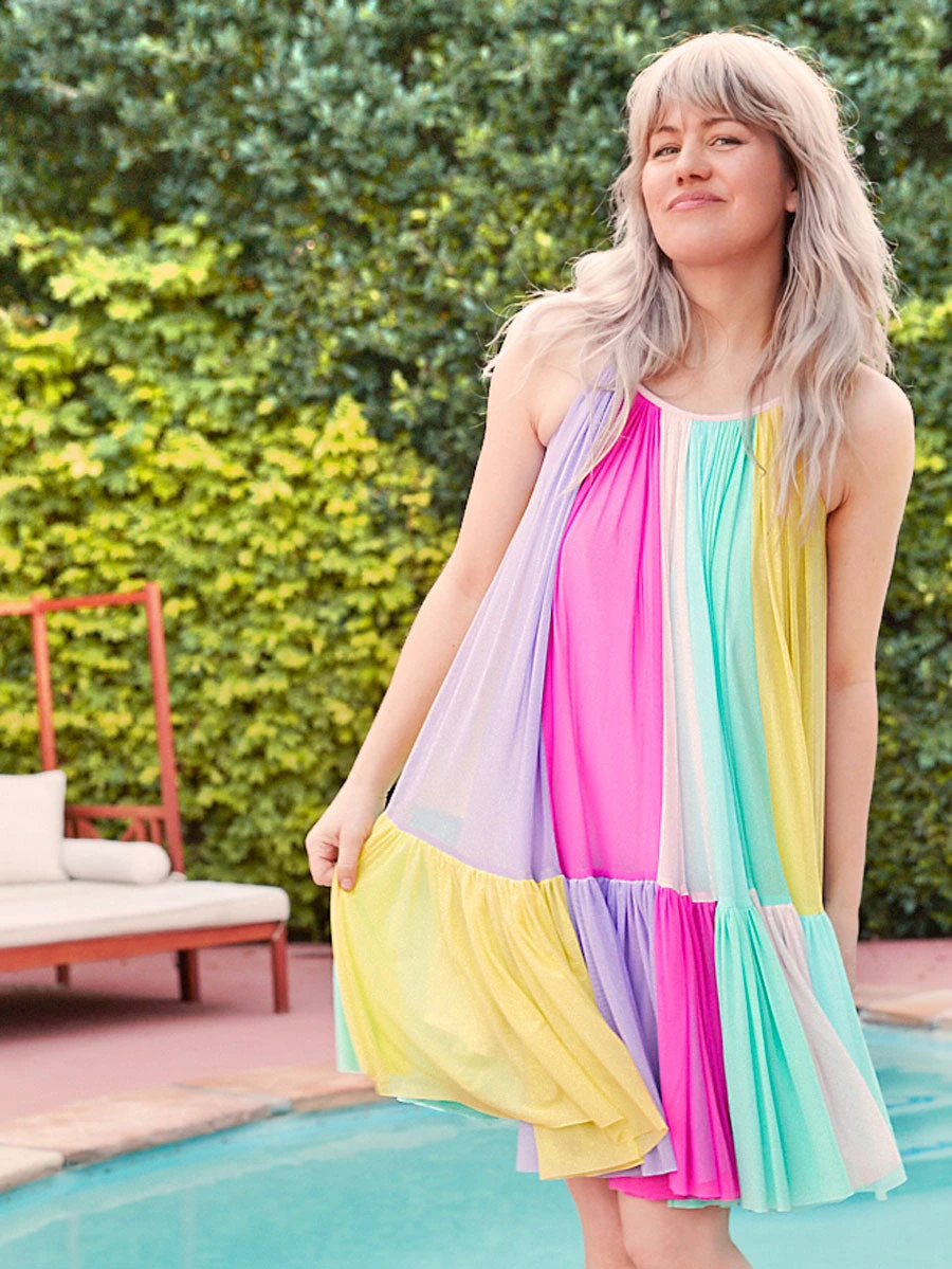 Match your mini with this vibrant, easy-to-wear dress. Made of soft mesh fabric in colorblock panels, it absolutely floats over the body. A deep bottom flounce, ties at the back of the neck, and a full lining round out the details. Sure to be a “mommy and me” favorite.